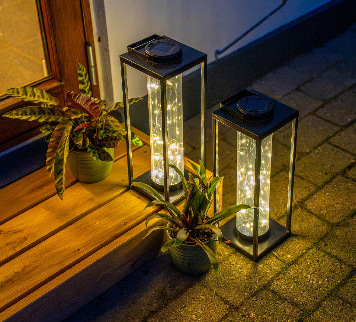 Skab en varm og magisk stemning i din have, på terrassen eller altanen med denne smukke solcellelanterne med integreret lyskæde.